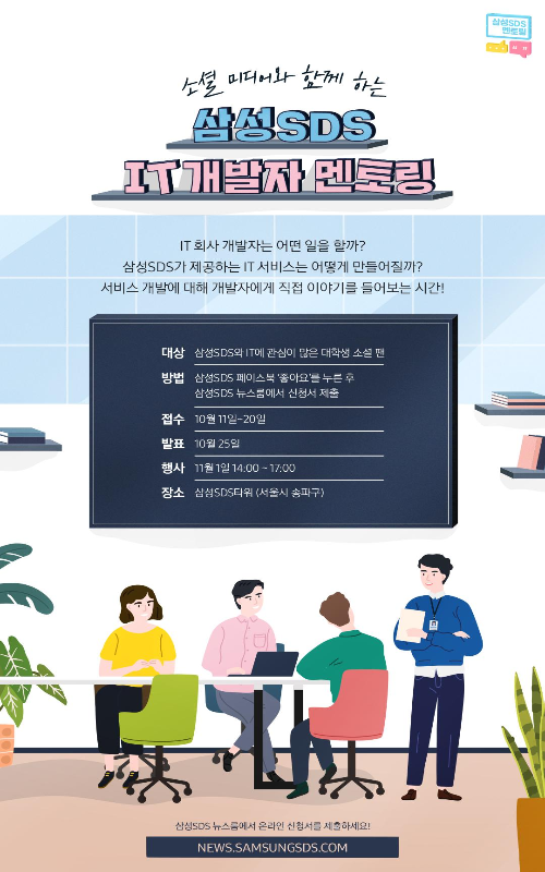 삼성 SDS는 소셜 팬과 소통하기 위해 매달 다양한 테마로 멘토링을 개최합니다. 2019년 11월에는 IT에 관심이 있는 소셜 팬들을 위해 IT개발자를 테마로 한 멘토링을 개최했습니다.
