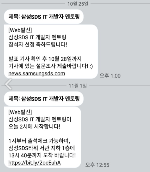 | 삼성SDS IT 멘토링 모집 포스터 | 합격 문자 |