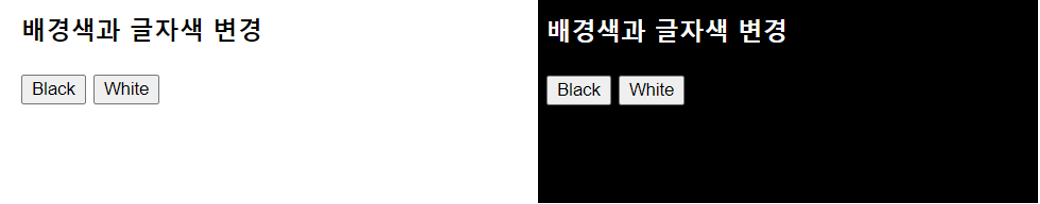 위의 코드를 실행시킨 화면을 보시면 화면의 배경색과 글자색이 바뀌는 것을 확인하실 수 있습니다.