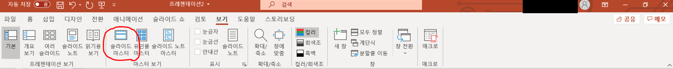 보기 -> 마스터 보기 -> 슬라이드 마스터 순으로 클릭해주세요.