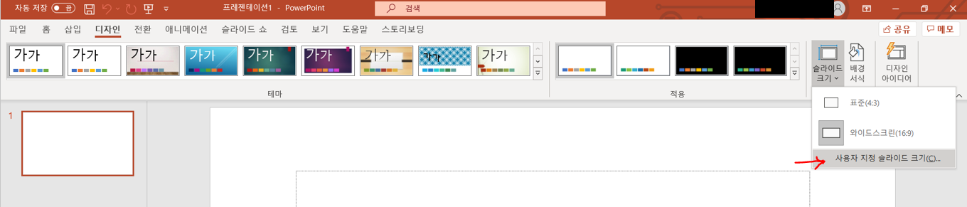 디자인 -> 사용자 지정 -> 슬라이드 크기 -> 사용자 지정 슬라이드 크기 순으로 클릭해주세요.