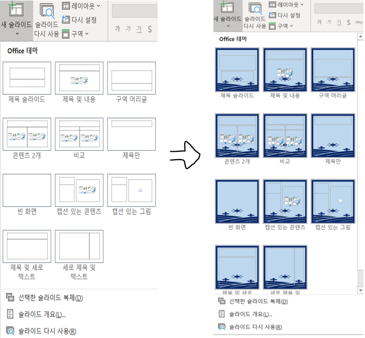 단, 리스트의 가장 위쪽에 있는 슬라이드의 레이아웃을 수정하면 모든 레이아웃에 적용되니 주의해주세요.