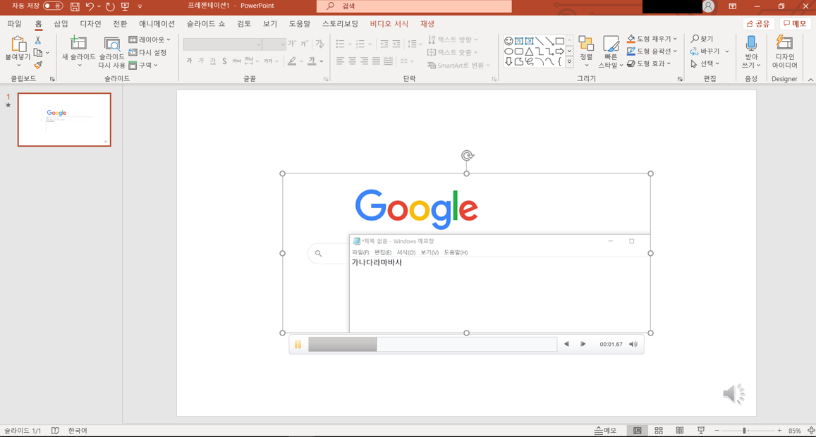 아래와 같이 녹화 내용이 영상으로 슬라이드 내에 삽입되는 것을 볼 수 있습니다.
