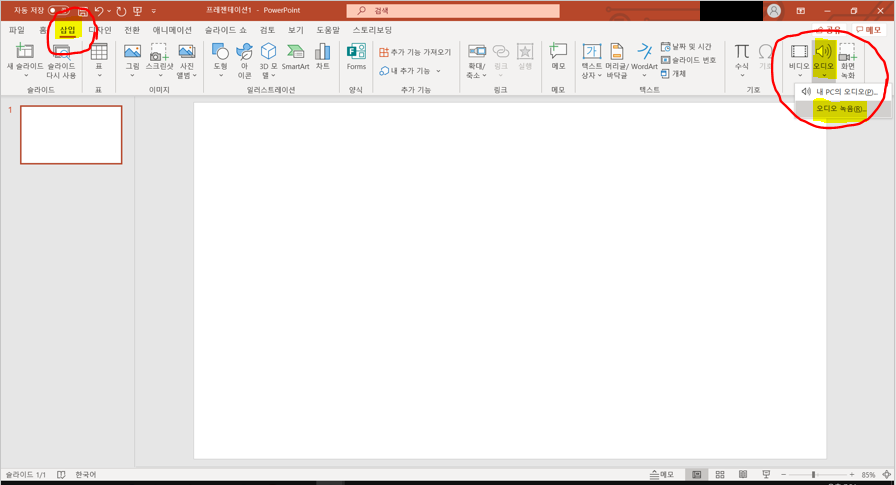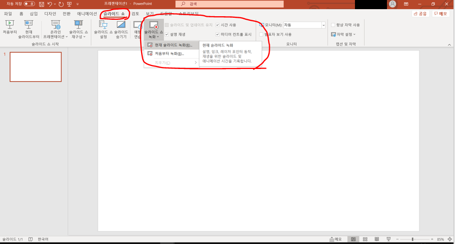 슬라이드 쇼 -> 설정 -> 슬라이드 쇼 녹화 -> 현재 슬라이드 녹화 순으로 진행해주세요.