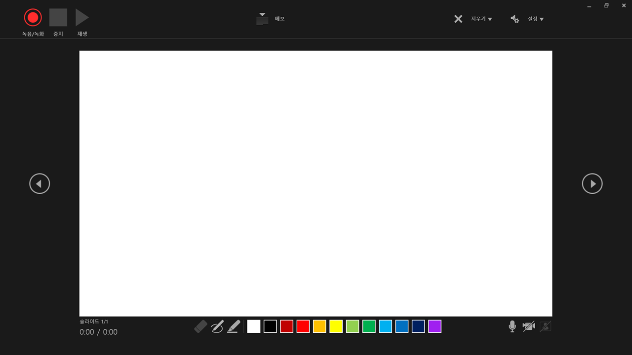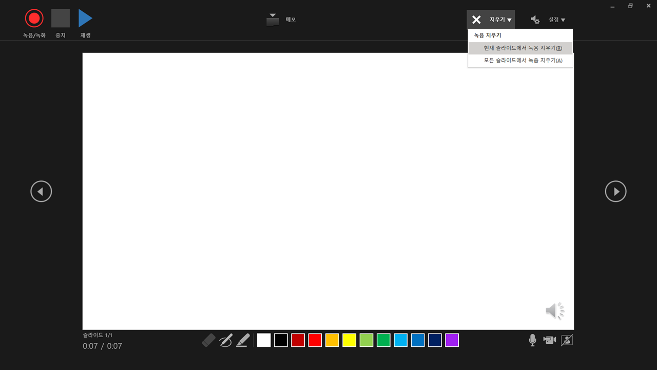 중지 버튼을 누르면 녹화가 중단되며 우측 하단에 녹음 아이콘이 생성됩니다. 그리고 좌측 하단을 보시면 녹화 시간이 표시됨을 알 수 있습니다. 녹화가 끝난 후에는 좌측 상단의 재생 아이콘을 눌러 녹화 내용을 확인할 수 있습니다. 녹화 내용을 확인한 후에는 다시 녹음/녹화 버튼을 눌러 이어서 녹화를 할 수도 있고 녹화 내용이 마음에 들지 않는다면 우측 상단의 지우기 메뉴를 통해 녹음을 지울 수 있습니다. 한 슬라이드의 화면 녹화가 끝났다면 슬라이드 좌/우의 화살표를 통해 이전 슬라이드 다음 슬라이드로 이동해 녹화를 계속 진행하거나 ESC를 눌러 녹화를 끝내시면 됩니다.
