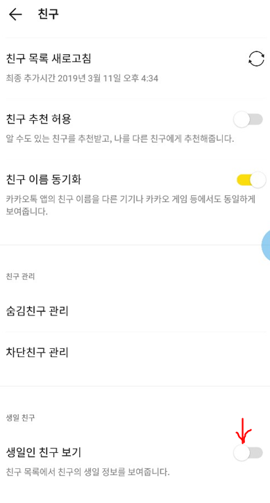 홈 ->설정 -> 친구 관리 -> 생일 친구 순으로 이동하셔서 생일인 친구 보기를 비활성화 하시면 됩니다.