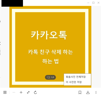 사진 보내기를 완료하셨으면 저장을 하시면 됩니다. 사진 묶어 보내기 기능을 사용할 경우 묶음사진 전체저장과 이 사진만 저장하기가 모두 가능하니 원하시는 방식으로 선택해 다운로드 하시면 됩니다.