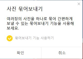 보내고자 하는 사진을 모두 선택하신 후 전송을 누르시면 아래와 같은 창이 새로 나타납니다. 확인을 눌러주세요. PC버전의 경우 처음 한 번만 설정하시면 그 다음부터는 자동으로 사진이 묶어서 전송됩니다.