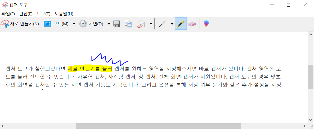 캡처를 완료한 후에는 펜, 형광펜, 지우개와 같은 그리기 도구를 사용해 캡처 이미지를 편집할 수 있습니다. 캡처 이미지가 만족스러우시다면 저장 버튼을 눌러 캡처 이미지의 이름과 저장 위치를 지정해주신 후 저장하시면 됩니다.