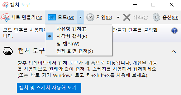 캡처 도구가 실행되었다면 새로 만들기를 눌러 캡처를 원하는 영역을 지정해주시면 바로 캡처가 됩니다. 캡처 영역은 모드를 눌러 선택할 수 있습니다. 자유형 캡처, 사각형 캡처, 창 캡처, 전체 화면 캡처가 지원됩니다. 캡처 도구의 경우 몇초 후의 화면을 캡처할 수 있는 지연 캡처 기능도 제공합니다. 그리고 옵션을 통해 저장 여부 묻기와 같은 추가 설정을 지정할 수 있습니다.