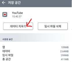 저장 공간을 누르셨다면 데이터 지우기와 임시 파일 삭제 버튼이 나타납니다.