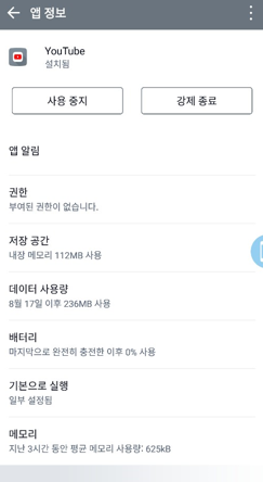 YouTube를 누르시면 해당 앱에 대한 정보가 나타납니다. 저장 공간을 눌러주세요.