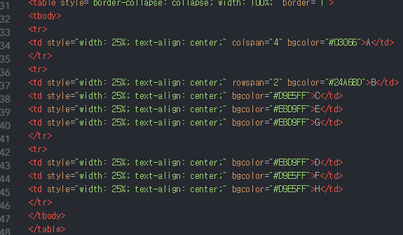 표의 색깔을 변경하기 위해서는 기본모드에서 html 모드로 전환하신 후 bgcolor = "색상코드"를 새로 추가해주어야 합니다.