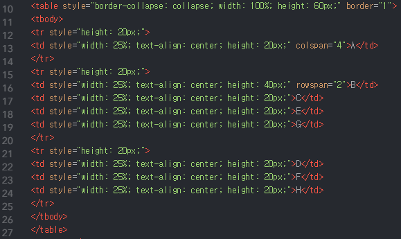 색이 지정되어 있지 않는 표1의 코드는 아래와 같습니다. 이 코드는 표1의 첫 행을 나타냅니다. 차례대로 행의 길이, 텍스트 정렬 방식, 행의 높이, 병합한 열의 수, 텍스트 내용을 알려줍니다. 이 코드에는 색에 대한 정보가 담겨있지 않습니다. 따라서 색에 대한 정보를 알려주는 코드를 새로 추가해야 합니다.