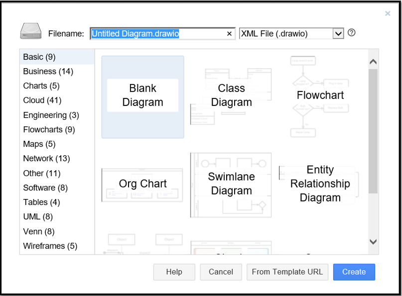 파일이름을 지정하시고 Blank Diagram을 눌러주세요. 특별히, 만들고자하는 다이어그램이 있다면 해당 다이어그램의 유형을 선택하셔도 됩니다.