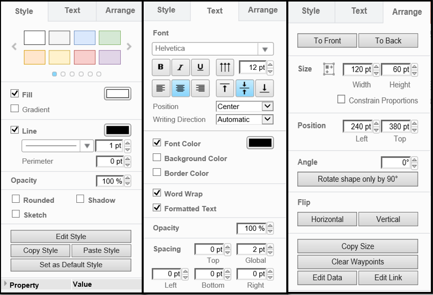 다이어그램을 모두 그리셨다면 다이어그램의 색, 글꼴, 글자크기 등의 디자인을 수정해줄 수 있습니다. 디자인 수정 도구들은 화면 우측에 있습니다. 전체 스타일을 지정하시고자하는 경우는 바로 화면 우측의 style 메뉴의 도구를 사용하시면 되고 개별적으로 수정을 하시려면 먼저 수정하고자 하는 부분을 클릭해주세요. 우측의 도구의 메뉴들이 바뀐 것을 확인할 수 있습니다. 해당 메뉴를 사용해 디자인을 수정하시면 됩니다.