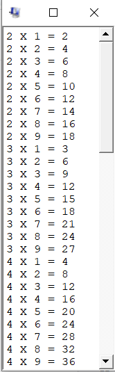 구구단을 출력해야하기 때문에 총 두 개의 반복문이 필요합니다. 각 단별로 총 9개의 곱셈식을 출력해야하기 때문에 n(2단~9단)을 증가시킬 반복문과 i(1~9)를 증가시킬 반복문이 필요합니다. 아래코드는 loop와 loop2를 사용해 구현하였습니다.