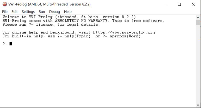설치가 끝난 후 SWI-Prolog를 실행시키면 아래와 같은 화면이 나타납니다. 이제 시스템을 사용하시면 됩니다.
