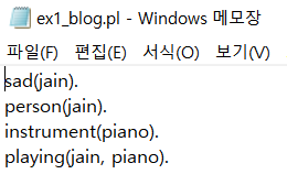 SWI-Prolog를 사용하기 위해서는 먼저 SWI-Prolog에 FACT와 RULE을 TELL해주어야합니다. 메모장을 실행시켜 코드를 작성해주세요. 편집기는 메모장이 아닌 다른 편집기를 사용해도 상관없으나 코드의 작성을 마친 후에는 반드시 '파일이름.pl' 형태로 저장해주세요.