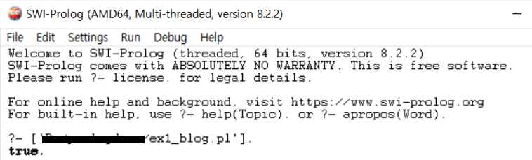 이제 작성한 파일을 학습시켜 주어야 합니다. SWI-Prolog를 실행시키고 커맨드 창에 ['파일위치경로/파일이름.pl']. 를 입력해주세요.