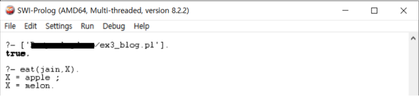 SWI-Prolog는 X=apple; X=melon. 이라는 결과를 출력합니다. apple, banana, melon이 과일이라고 정의되어 있지만 apple, melon과는 달리 banana는 jain과의 관계가 정의되어 있지 않기 때문에 X의 값으로는 apple과 melon만 출력됩니다.