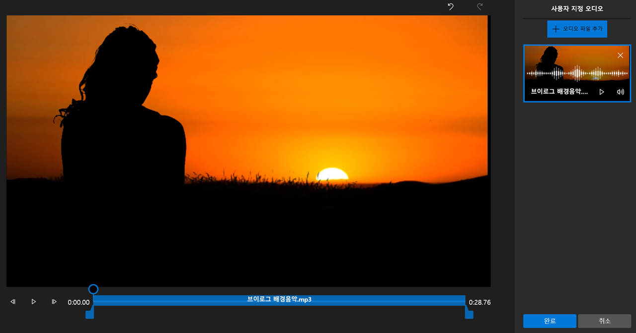 윈도우 비디오 편집기는 외부에서 오디오 파일을 불러와 사용할 수 있습니다. 우측 상단에 메뉴 중 사용자 지정 오디오를 클릭해주세요.