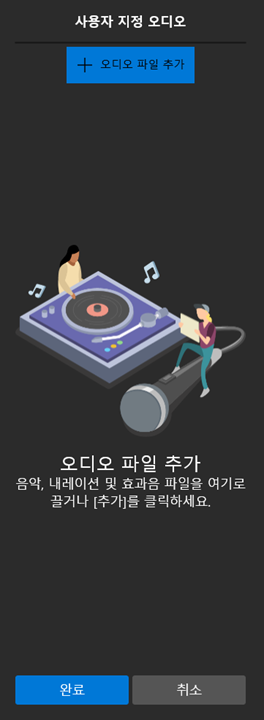그리고 화면이 전환되면 사용자 지정 오디오 아래의 오디오 파일 추가 버튼을 발견하실 수 있습니다. 이 버튼을 클릭해 삽입하고자 하는 오디오 파일을 찾아 추가하시면 됩니다.