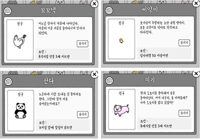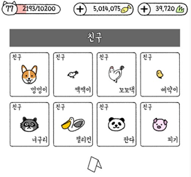 현재 저는 '강아지, 참새, 닭, 병아리, 너구리, 펠리컨, 판다, 돼지' 총 8개 유형의 동물 친구들을 찾았습니다.