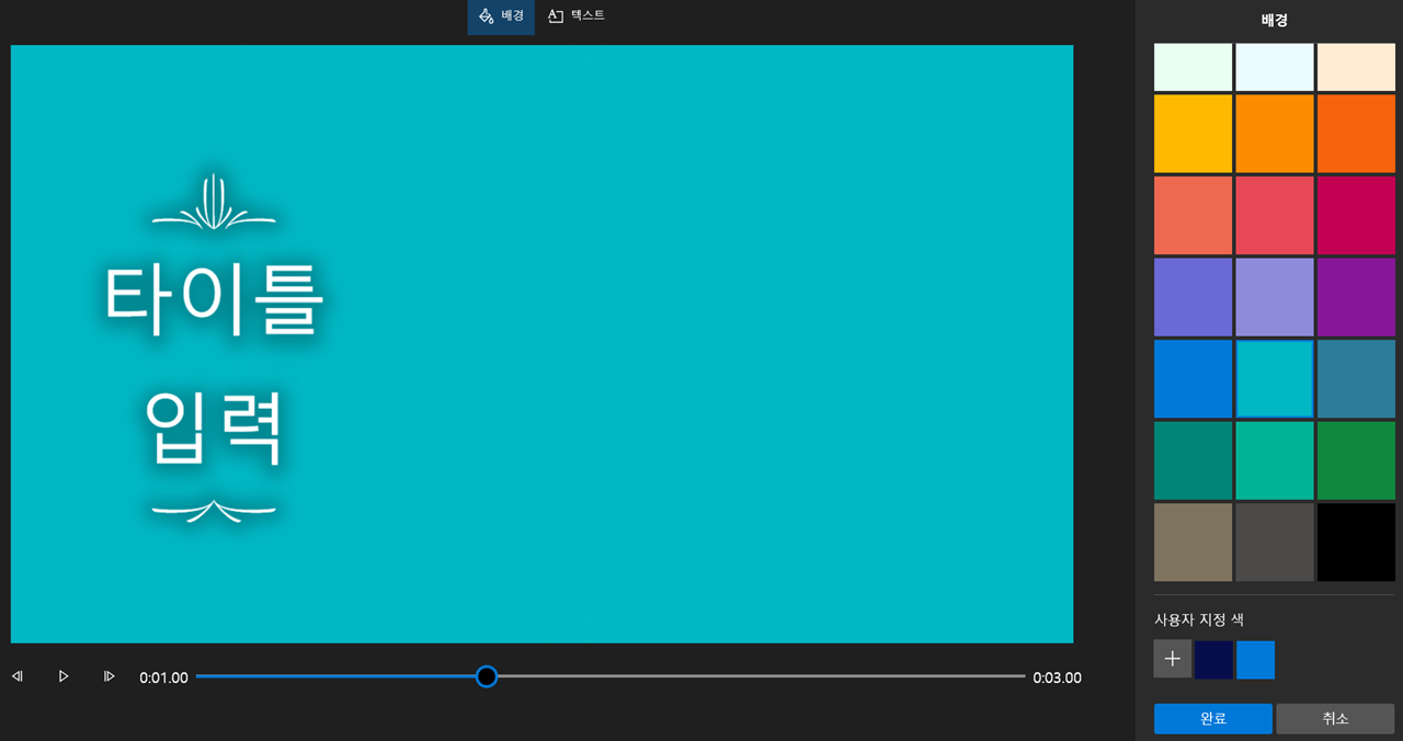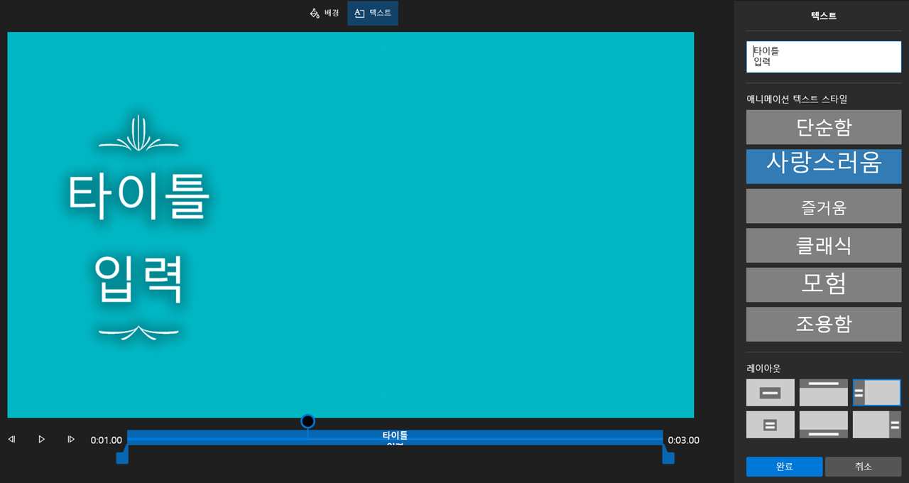 텍스트 수정 환경으로 화면이 전환되셨다면 우측 상단에 텍스트를 입력하시고 텍스트 스타일과 레이아웃을 지정해주세요. 텍스트가 출력되는 시간대는 하단의 파란색 영역을 조절하시면서 설정하실 수 있습니다. 그리고 상단의 배경을 클릭해 배경 수정 화면으로 전환하실 수 있습니다.