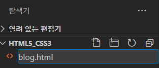이제 '예시입니다'라는 텍스트를 출력하는 html파일을 만들어보겠습니다. 먼저, 불러온 폴더의 이름 옆에 보시면 4개의 아이콘이 있습니다. 이 중에서 첫번째 아이콘 새 파일을 클릭해주세요.