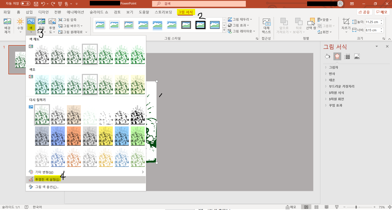 먼저 수정하고자 하는 그림을 선택해주세요. 그러면 위쪽의 메뉴바에 '그림 서식' 메뉴가 나타납니다. 이를 클릭해주세요. 그림 서식을 클릭해 도구들이 나타났다면 '색 ->투명한 색 설정' 순으로 클릭하신 후 마우스 포인터의 모양이 변경되었다면 수정하고자 하는 그림을 클릭해주세요.