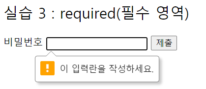 특정 영역을 필수 영역으로 바꾸어 사용자가 반드시 입력하도록 하기 위해서는 required를 사용하면 됩니다. required를 사용하면 사용자가 필수 영역으로 지정된 부분을 입력하지 않은 채로 폼을 제출할 경우 경우 경고 메시지가 나타나며 폼이 제출되지 않습니다.